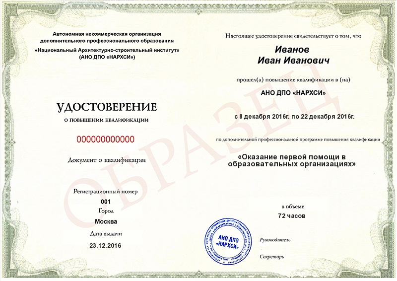 - Образец удостоверения о повышении квалификации.