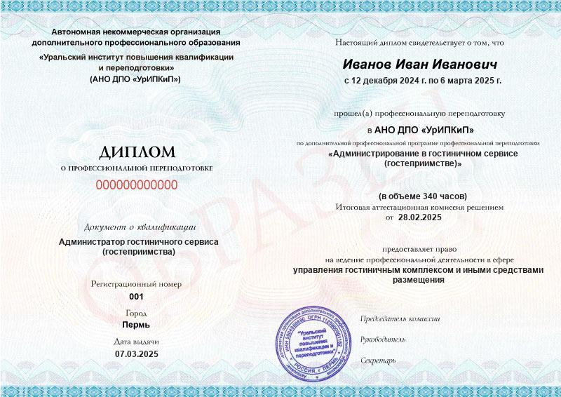 • Квалификация: Администратор гостиничного сервиса (гостеприимства)