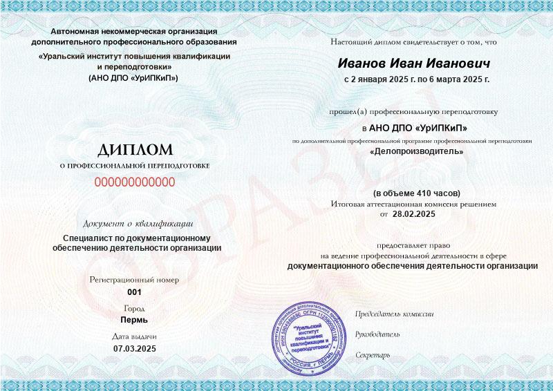 Да, дипломы и удостоверения оформляются в соответствии с действующим законодательством РФ. Документы печатаются на специальных бланках, заверяются печатью АНО ДПО «УрИПКиП».