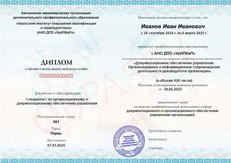 Да, дипломы и удостоверения оформляются в соответствии с действующим законодательством РФ. Документы печатаются на специальных бланках, заверяются печатью АНО ДПО «УрИПКиП».
