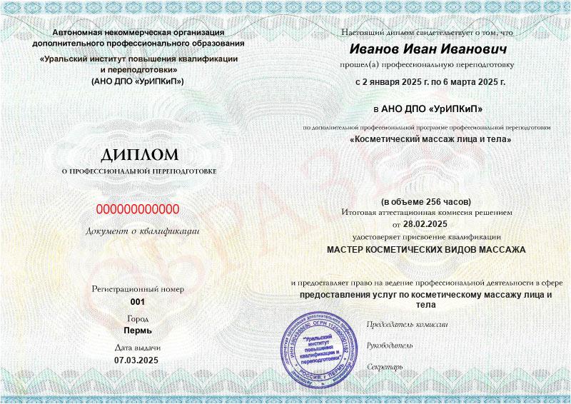 Да, дипломы и удостоверения оформляются в соответствии с действующим законодательством РФ. Документы печатаются на специальных бланках, заверяются печатью АНО ДПО «УрИПКиП».