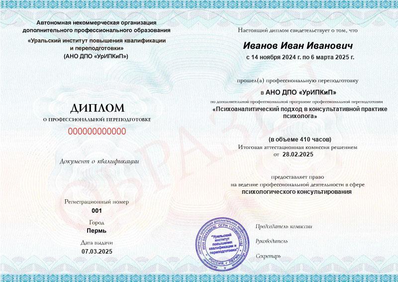 - Образец диплома о профессиональной переподготовке.