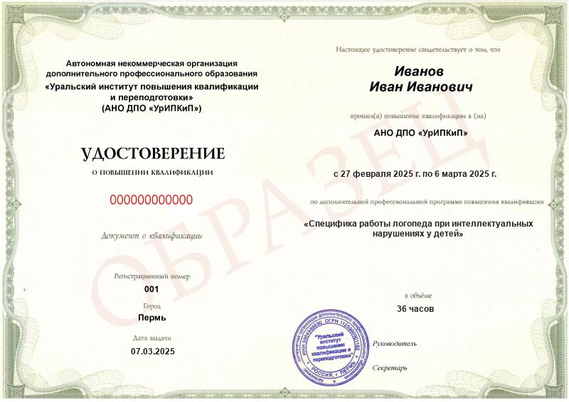 - Образец удостоверения о повышении квалификации.